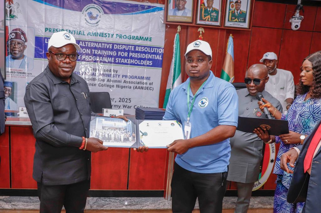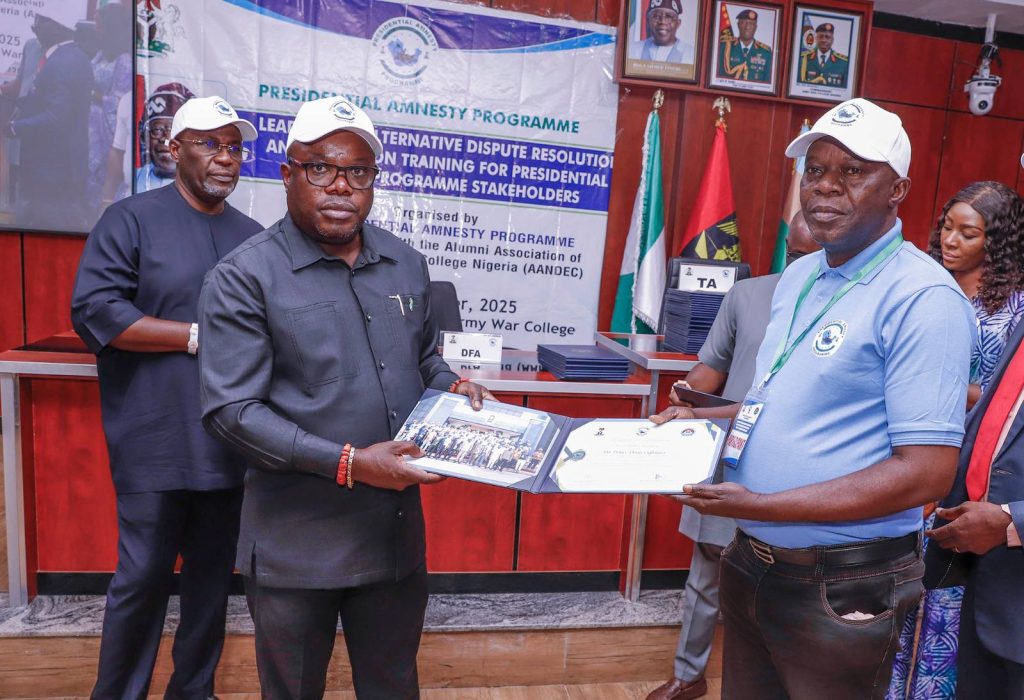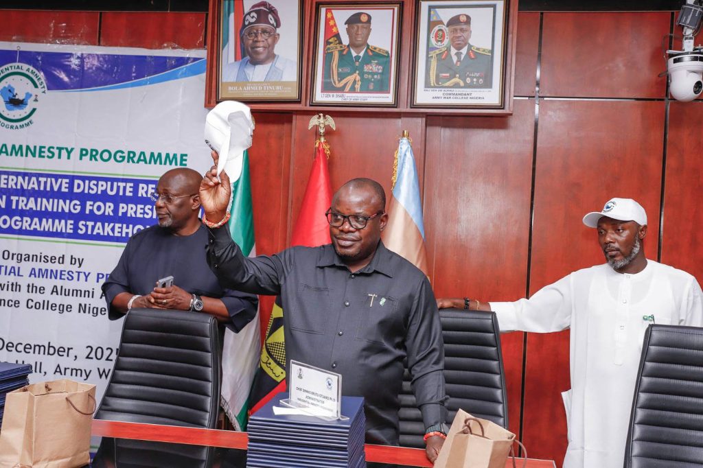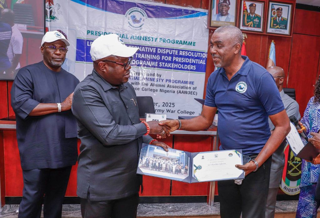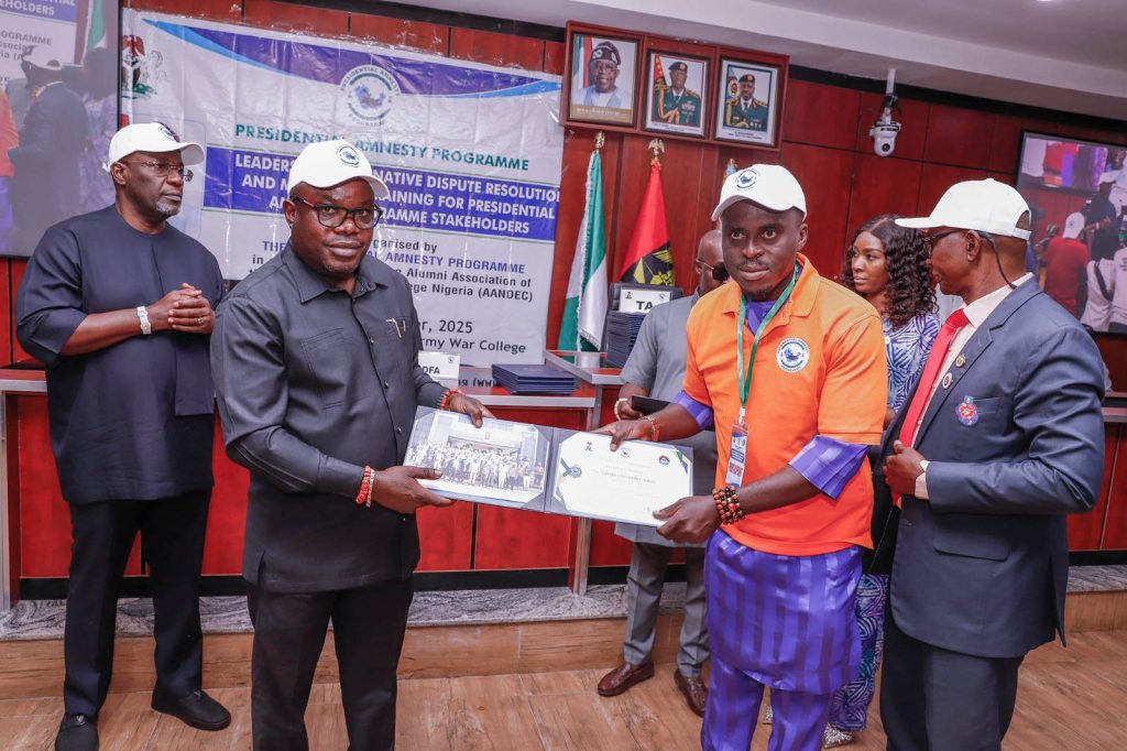 Today, the able Administrator of the Presidential Amnesty Programme, Dr Dennis Brutu Otuaro, presented certificates to the 5th batch participants of the two-day “Leadership, Alternative Dispute Resolution, and Mediation Training for PAP Stakeholders” organised by the agency in collaboration with the Alumni Association of the National Defence College (AANDEC) at the Nigerian Army War College, Abuja.