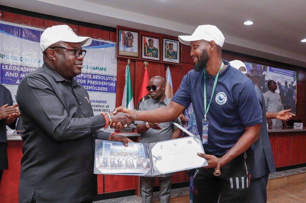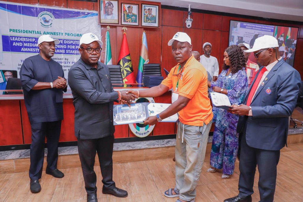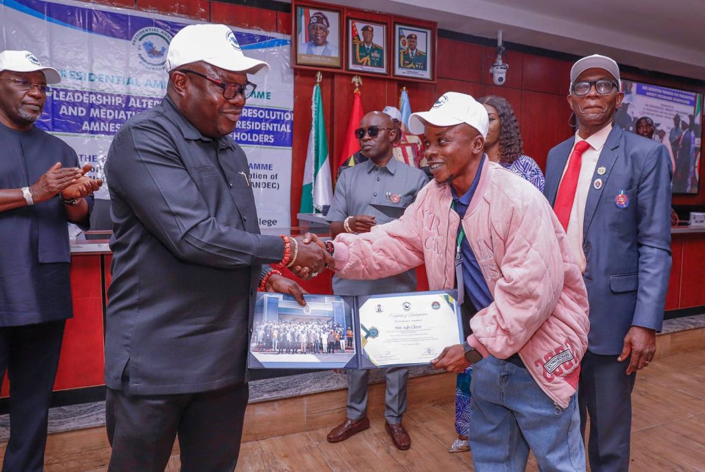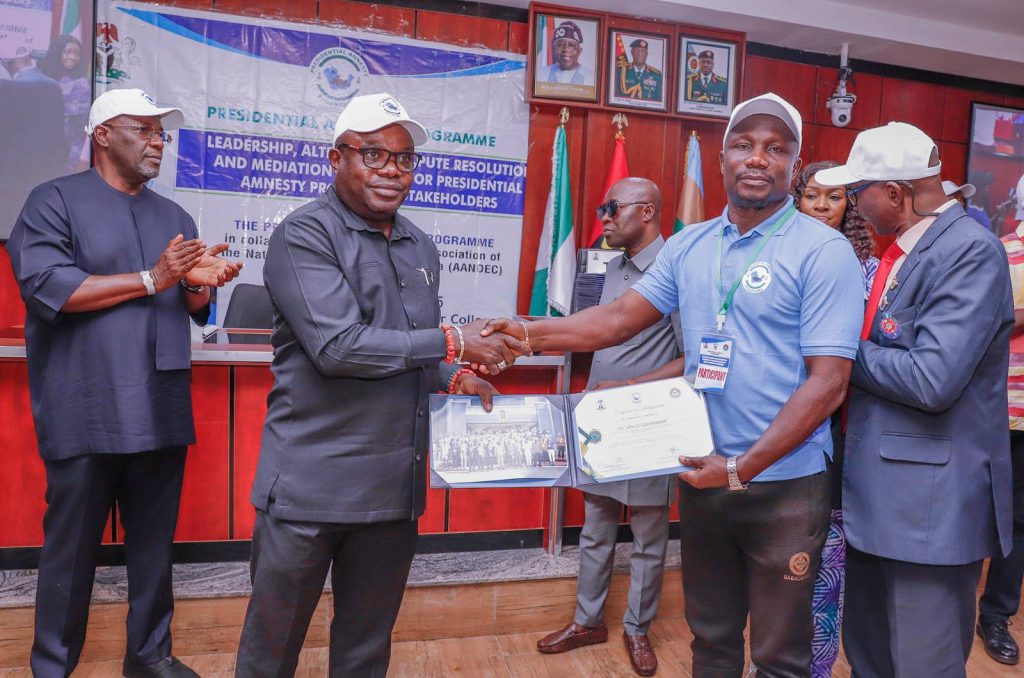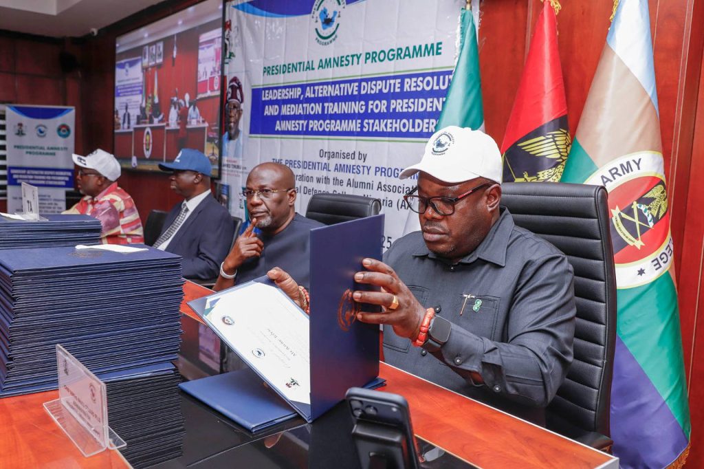 Today, the able Administrator of the Presidential Amnesty Programme, Dr Dennis Brutu Otuaro, presented certificates to the 5th batch participants of the two-day “Leadership, Alternative Dispute Resolution, and Mediation Training for PAP Stakeholders” organised by the agency in collaboration with the Alumni Association of the National Defence College (AANDEC) at the Nigerian Army War College, Abuja.