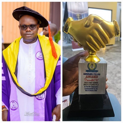 The management of the Delta State College of Health Sciences and Technology, Ofuoma-Ughelli, has bestowed the Award of Honorary Fellow of the College on the dynamic Administrator of the Presidential Amnesty Programme, Dr Dennis Brutu Otuaro, in recognition of his ‘Consolidation of Peace & Development in the Niger Delta’.