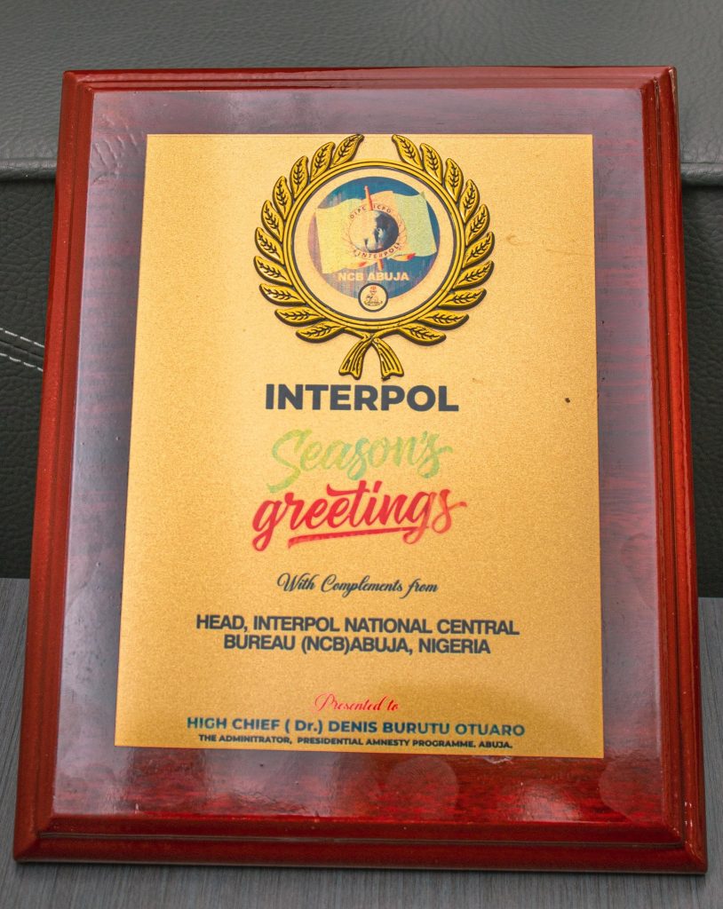 Today, the dynamic Administrator of the Presidential Amnesty Programme, Dr Dennis Otuaro, received a plaque in his office in Abuja presented to him by the INTERPOL National Central Bureau (NCB), Abuja, in recognition of his support to the INTERPOL NCB and the Nigeria Police Force in general, and meritorious service to the nation.
